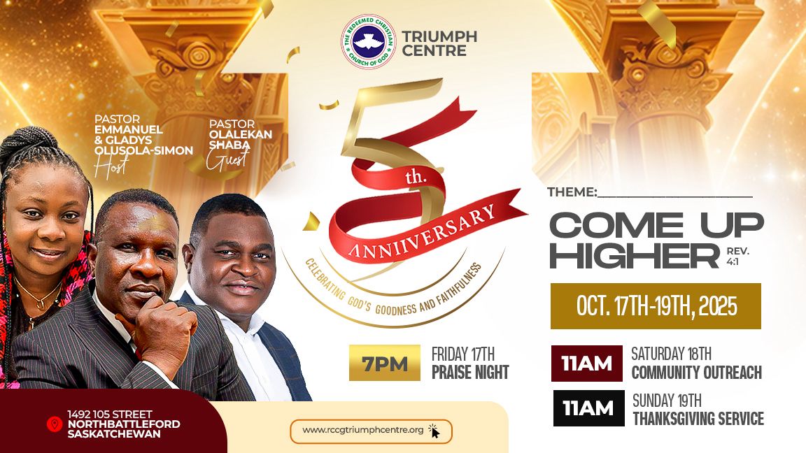 The Triumph centre is a parish of the Redeemed Christian Church of God (RCCG), one of the largest and fastest-growing pentecostal churches in the world. RCCG started in 1952 with just 12 members, but has today grown into a megachurch with parishes spread across the 5 continent of the world and having Pastor Adeboye as the General overseer, In 2018, A prayer and bible study group was formed in North Battleford SK, Canada, under the leadership of Pastor and Pastor(Mrs) Olusola-Simon, with the help of our dear friend; Pastor Olalekan Saba who join us online from Regina every Tuesday of the week to fast and pray for God to take over the land.